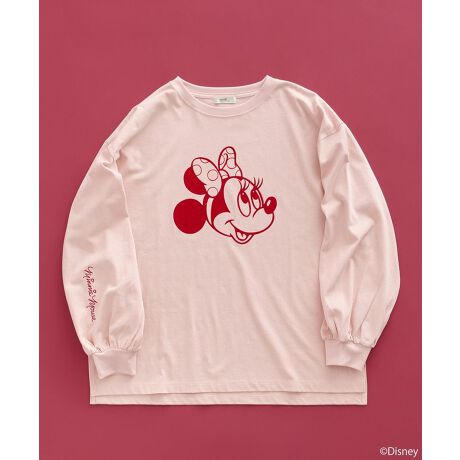 ちょっとお茶目な表情をしたミッキーと仲間たちのアートをフロッキープリントが目を引くロンT。