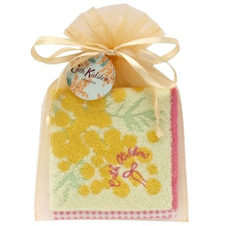オーガンジー巾着に入った、ギフトにぴったりのタオルハンカチ。ミモザ柄がのイエローが目を惹くタオルはふわふわで手触り抜群です。