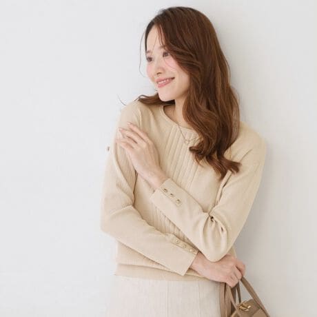太さの異なるリブ見え編組織を組み合わせたニットトップス。