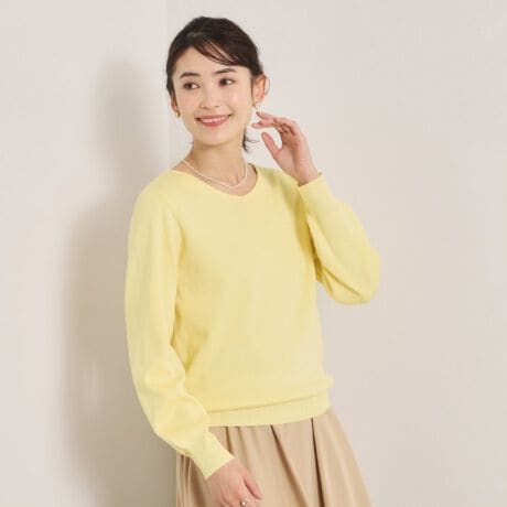 きちんと感を演出できるVネックデザインはオフィスシーンでも好印象。