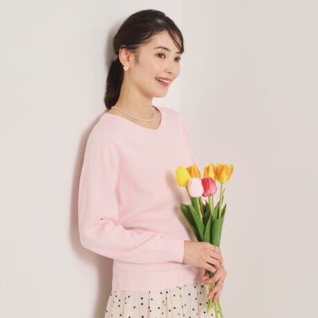 きちんと感を演出できるVネックデザインはオフィスシーンでも好印象。