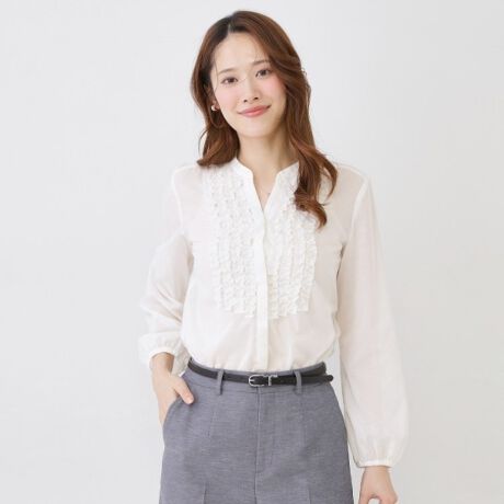 華やかな前フリルが目を惹くシアーローンブラウス。
