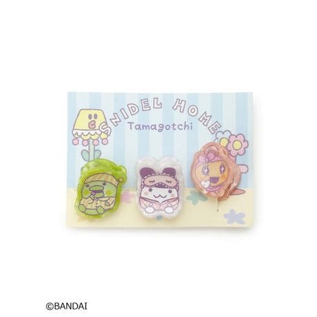 アイマスクやナイトキャップなど、ルームウェアをまとった「たまごっち」たちをモチーフにした3個セットのミニヘアクリップ。