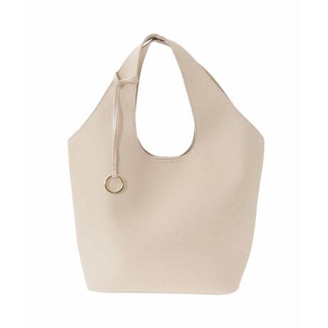 ONにもOFFにも合わせやすいトートバッグ。A4サイズの用紙も収納出来るきれいめフォルムです。リングのチャームがきらりと光るアクセントに。お手入れが簡単な合成皮革です。