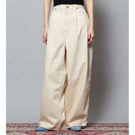 デニムの概念を覆す、大胆なワイドシルエットが魅力の「タックライダースパンツ」。