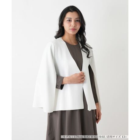 前身頃は布帛、袖部分はニットを組み合わせた異素材使いのケープジャケットです。ニット地は高い伸縮性と復元力を備えたドライな手触り。布帛部分もストレッチ性の高い素材を使用しています。フレア袖のように見えるケープデザインは、羽織るだけでエレガントで女性らしい印象に。きちんと感もあるため、フォーマルな場面でも活躍します。着崩れを防ぐため、身頃の裏側にはニットの裏地が付いています。