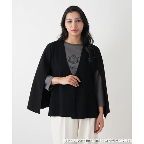前身頃は布帛、袖部分はニットを組み合わせた異素材使いのケープジャケットです。ニット地は高い伸縮性と復元力を備えたドライな手触り。布帛部分もストレッチ性の高い素材を使用しています。フレア袖のように見えるケープデザインは、羽織るだけでエレガントで女性らしい印象に。きちんと感もあるため、フォーマルな場面でも活躍します。着崩れを防ぐため、身頃の裏側にはニットの裏地が付いています。