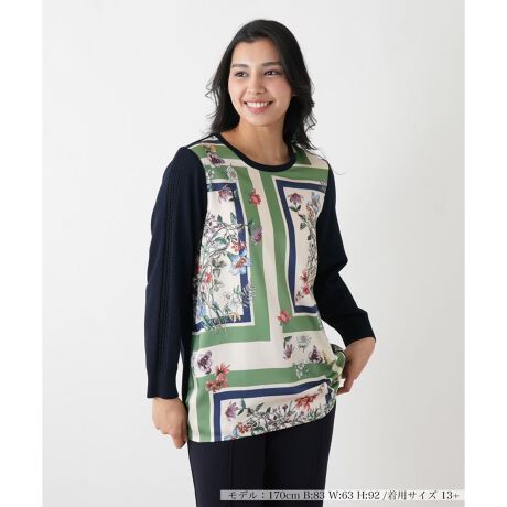ニットとプリント素材を大胆に組み合わせた、一枚で様になる異素材コンビのチュニックプルオーバーです。前身頃にはイタリア製の上質なプリント素材を使用し、華やかなボタニカル柄が着こなしにアクセントを添えます。袖と後ろ身頃には、ドライ感のある光沢糸を使用した薄手で上品なニット素材を使用。ヒップが隠れるチュニック丈と程よいゆとりで、パンツスタイルと好相性。快適な着心地と華やかさを両立した一着です。
