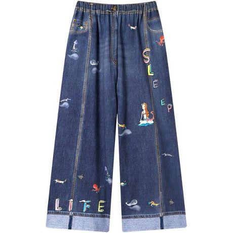 [型番:UOX510]・本体に、綿100%のミニ裏毛素材を使用・デニム風のプリントでカジュアルなデザイン・スワンボートの旅が始まり、湖から海へとボートを漕いでいて出会ったゆかいな仲間たちとの様子を表現した柄・股上がゆったりしたワイドパンツ・両サイドにポケットあり※お洗濯は、必ず「取扱い表示」にしたがってください。