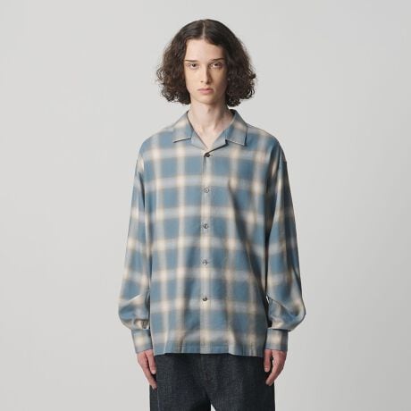 インナー使いから春の羽織まで活躍する、程よい肉感の綿/レーヨンオンブレチェック生地を使用したオープンカラーシャツ。