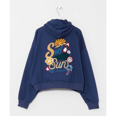 [型番:4CA-6153-2026]サガラ刺しゅうと機械刺しゅうを組み合わせたデザインが印象的なフード付きトップス。短丈シルエットでバランスよく着こなせ、裏毛素材のやさしい肌触りが魅力。カジュアルな中にもハワイらしい明るさを感じる一枚です。