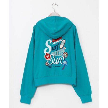 [型番:4CA-6153-2026]サガラ刺しゅうと機械刺しゅうを組み合わせたデザインが印象的なフード付きトップス。短丈シルエットでバランスよく着こなせ、裏毛素材のやさしい肌触りが魅力。カジュアルな中にもハワイらしい明るさを感じる一枚です。