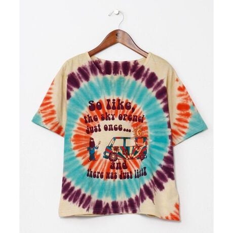 [型番:IAT-6101-2026]ヒッピームードあふれるタイダイ柄のTシャツ。ヴィンテージ感ある色合いとすっきりとしたシルエットが魅力。衿まわりは丈夫で型崩れしにくい縫製で、ラフながらもきれいに着られる仕様。蝶々、バス、きのこの3柄展開。