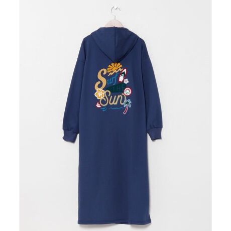 [型番:4CA-6154-2026]サガラ刺しゅうと機械刺しゅうを組み合わせたポップなデザインが目を惹くフード付きワンピース。やわらかな裏毛素材で着心地が良く、カジュアルながらも遊び心のあるスタイルを楽しめます。