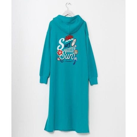 サガラ刺しゅうと機械刺しゅうを組み合わせたポップなデザインが目を惹くフード付きワンピース。やわらかな裏毛素材で着心地が良く、カジュアルながらも遊び心のあるスタイルを楽しめます。