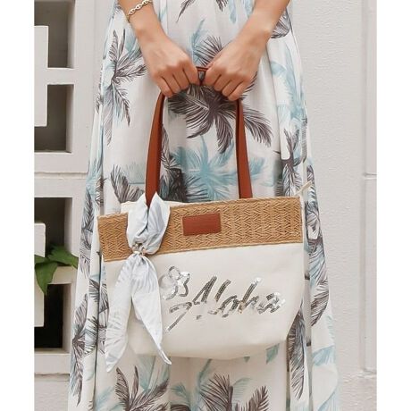 スパンコールのALOHAロゴが目を惹くミニトートバッグ。デイリー使いにちょうどいいサイズ感で、ファスナーと内ポケット付きの安心設計。軽やかで持ち運びやすく、リゾートコーデにもぴったり。