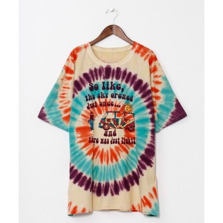 [型番:IAT-6102-2026]ヒッピームードあふれるタイダイ柄のメンズTシャツ。古着のような風合いとすっきりシルエットで着こなしやすい一枚。蝶々、バス、きのこが主役の個性派デザイン。