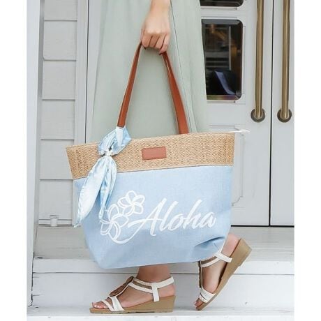 [型番:42QP6101-2026]ALOHAのスパンコールロゴが輝くトートバッグ。軽くて大容量、内ポケット付きで収納も安心。ビーチやショッピングにぴったりのサイズ感で、リゾート気分を高める華やかなデザイン。