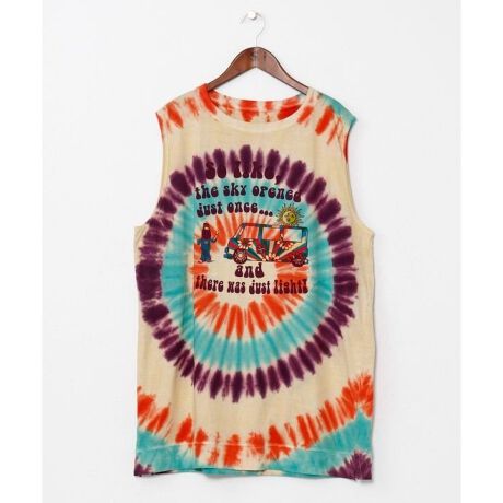 [型番:IAT-6104-2026]ヒッピームードあふれるタイダイ柄のメンズタンクトップ。古着感のある色合いとボックスシルエットで一枚でもきまる。蝶々・バス・きのこをモチーフにした3柄展開。