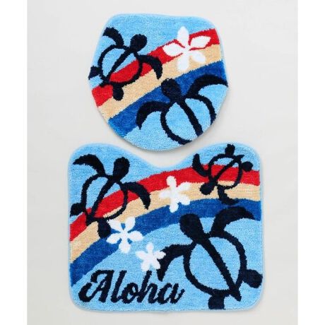 [型番:4ILP6102-2026]ハワイの守り神ホヌと虹が描かれたトイレセット。やわらかな色合いと立体的な刺しゅうがポイントで、毎日の空間を明るくハワイアンに彩ります。フタカバーとマットのセットです。