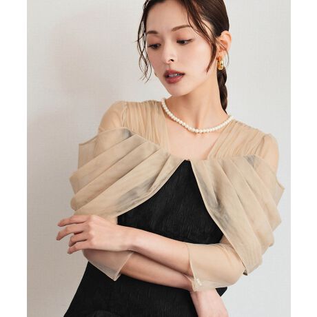 デコルテ部分はオフショルダー風のデザインに仕上げ、異素材を組み合わせることでさりげない抜け感と奥行きをプラスしました。