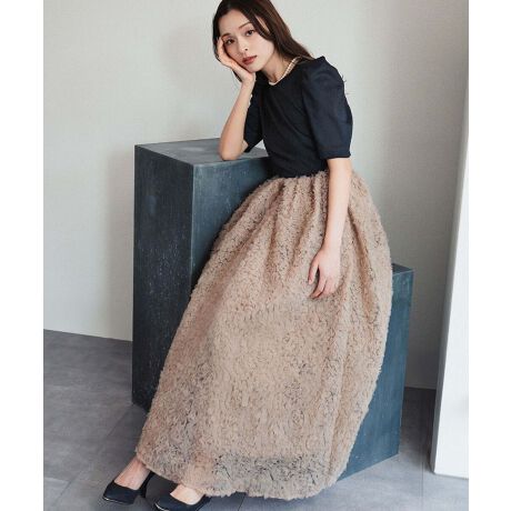 たっぷりのチュールを使ったふんわりフラワーチュール刺繍のもこもこスカートに、ぴったりシルエットの5分袖トップスを合わせたセットアップ。