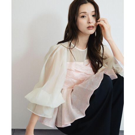 トップスは異素材をMIXしたデザインで、立体感のある袖コンシャスなシルエットが印象的です。