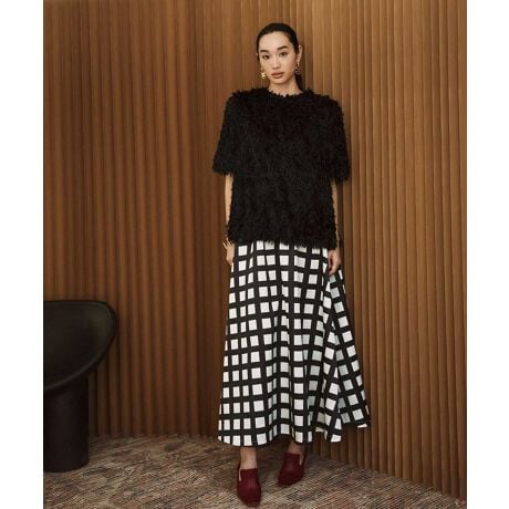 立体感のあるテキスタイルでシンプルなコーディネートに奥行きをプラスし、羽織るだけで旬なムードに。