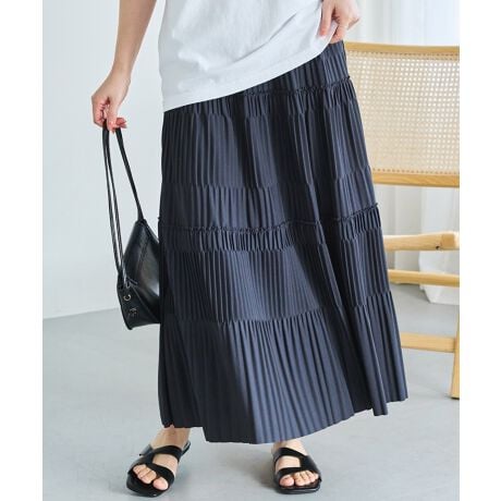 細かなプリーツとティアード風の切り替えデザインを組み合わせた、表情豊かなロングスカート。