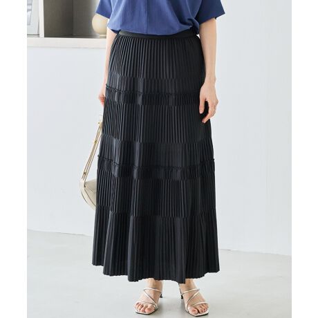 細かなプリーツとティアード風の切り替えデザインを組み合わせた、表情豊かなロングスカート。