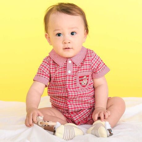 2種類のチェックを組み合わせた、遊び心のある男の子用半袖ロンパース。