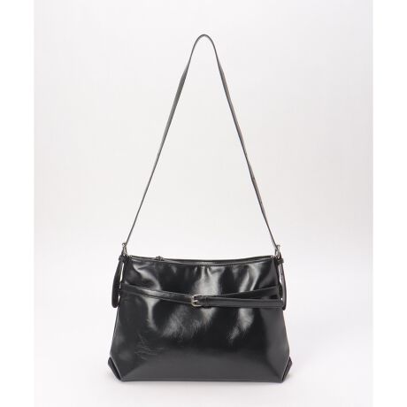 艶のある合皮の風合いが印象に残る、ベルテッドデザインのショルダーバッグ。
