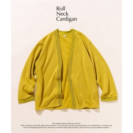 ロールネック仕様のニットカーディガン。柔らかな風合いと、程よいハリ感を併せ持ち、カットソー感覚で気軽に取り入れられる一着です。