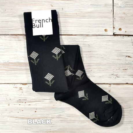 点描で表現したお花を散りばめた柄のロング丈のハイソックスです。柔らかな綿糸で薄く編み立てました。伸縮よく、柔らかな履き心地です。タイツのようにスカートやワンピースに合わせても可愛い1足です。