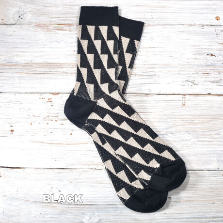 幾何学柄のジャガード編みのソックスです。ベースはガス焼処理により毛羽を抑えたシルケットの綿糸で、程よい厚みに編み立てました。シャープな柄と配色が目を引き、鮮やかなカラーは差し色としても。カジュアルスタイルに合わせやすい1足です。