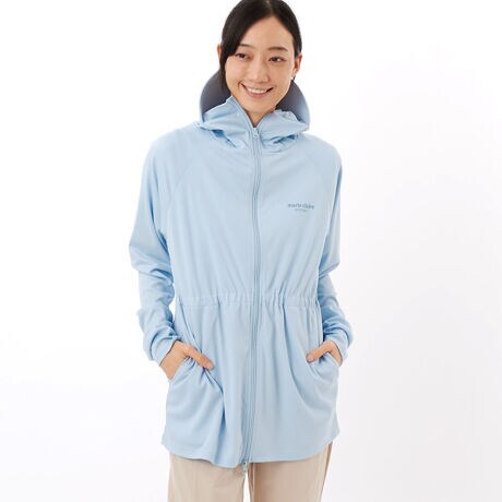 [型番:414708]バイザー付きUVパーカーは、フード後ろがドットボタンあきのベンチレーションになっていて、髪の毛を出すこともできます。様々なヘアスタイルに対応可能。夏の暑い日も、フード後ろを開けることで熱を逃すことができます。フェイスカバー付き。首やデコルテを日差しからしっかりカバー。サムホール付きで、手の甲までカバー。長めのたけでお尻まで隠れるので、体型もカバーできます。胸元には、marie claireのブランドロゴのプリント。
