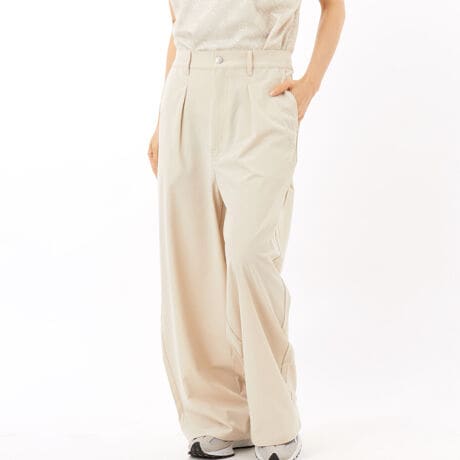 腰回りをすっきり見せるタック入りのデザインでゆったりと着れるワイドシルエットのパンツです。