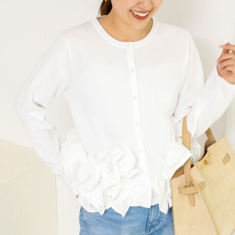 ・裾にあしらった立体的なフリルデザインが、シンプルながら華やかな印象のカーディガン