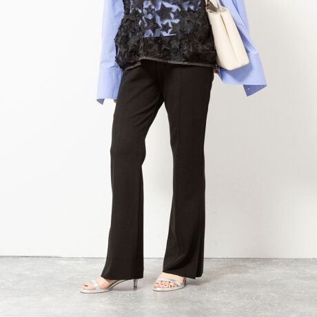 ・センターシーム入りで、脚をまっすぐ長く見せる美脚シルエットフレアパンツ