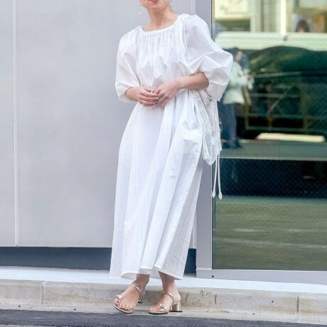 ・ネックラインにゴムを入れたデザインで、程よい抜け感とリラックス感を演出するワンピース
