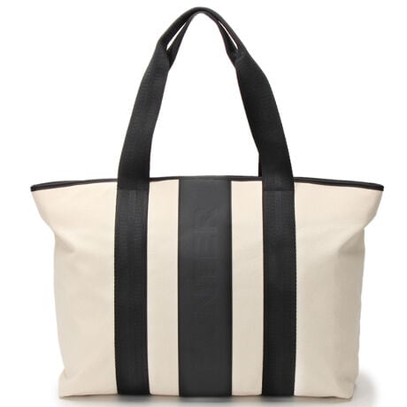 [型番:UBS3701CAA]雨に強い撥水加工の100%オーガニックコットン製トート。横幅約55cmで、男性が持ってもバランスが取りやすい大きめのサイズです。カジュアルでありながらエレガントなデザインで、ストラップを付ければ肩掛けや斜め掛けでもお使いいただけます。内側に小さな貴重品を入れるのに便利なジップポケット、底鋲付き。