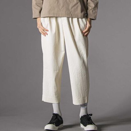 ドビーストライプの太い畝のような織り柄がさりげなく表情を添える、9分丈のパンツ。