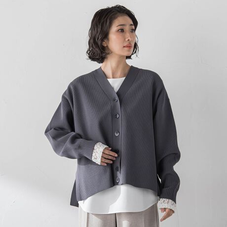 スポンディッシュなポリエステル素材で編み立てた、軽やかなカタアゼ編みのカーディガン。
