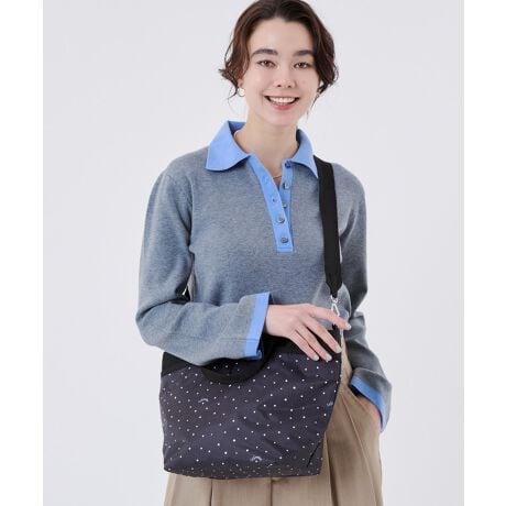 ブラックベース×ホワイトのドット柄デザイン。大小さまざまなドットがランダムに並び、ラフで遊び心のある印象に。シンプルなモノトーン配色でどんなコーディネートにも合わせやすく、シーズンレスで活躍します。