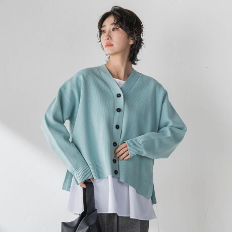 フォルムが出る地厚の編地で仕立てながらも、糸自体の嵩高性と軽量感で着心地も兼ね備えた一枚。