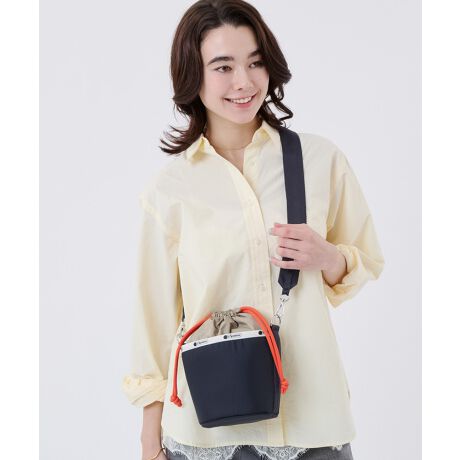 コンパクトサイズのバケットバッグ。芯材入りで自立し、開閉は巾着仕様でセキュリティ面も安心。ミニ財布やスマホなどの必需品をスマートに収納でき、内側には前後にオープンポケットがあり、小物もすっきり収納できます。トップのウェビングハンドルは手に馴染む幅広デザインで持ちやすく、取り外し可能なショルダーストラップ付で、手持ち・肩掛け・斜め掛けと、スタイルに合わせて楽しめます。
