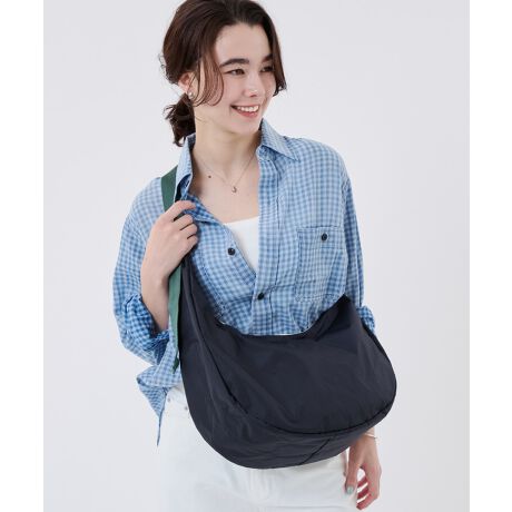 丸みのあるフォルムで、身体に心地よくフィットする大きめショルダーバッグ。長さ調整可能なストラップで、自分好みのスタイルが楽しめます。マチ幅が広く、B5サイズや500mlのペットボトルもゆったり収納でき、日常使いからレジャーシーンまで幅広く活躍します。