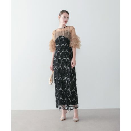 全身に施された繊細なスパンコールフリンジと、柔らかなチュールボレロが織りなす至高のロングドレス。