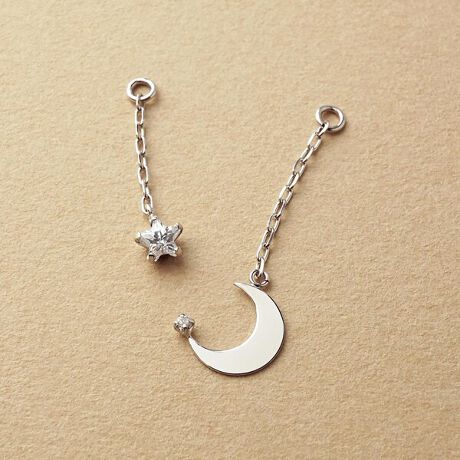 左右アシンメトリーの月&星のピアスチャーム。地金の月がダイヤモンド(4月誕生石)と共にクールに輝きます。遊び心ある大人のデザインでお顔周りを華やかにしてくれます。ホワイトゴールドで上品な印象にしあがりました。