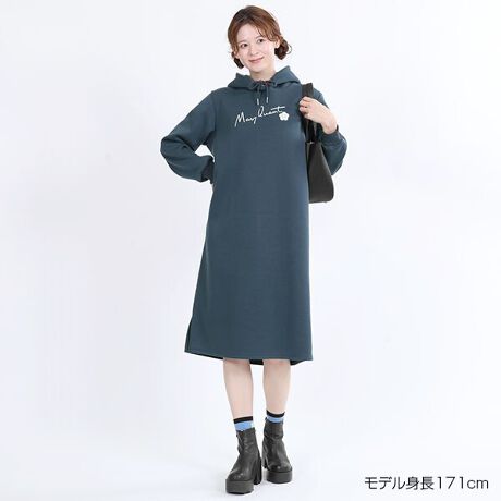 ボンディング素材のパーカ・ワンピース。◆ポイント・ハリ感のある素材で体型カバーも・FRONTにサインロゴプリント・両脇ポケット付き・両脇スリット入り・長袖◆コーディネート縦ラインを意識し、カジュアルながらすっきりとしたシルエットでスタイルアップにも。[型番:226-401900]